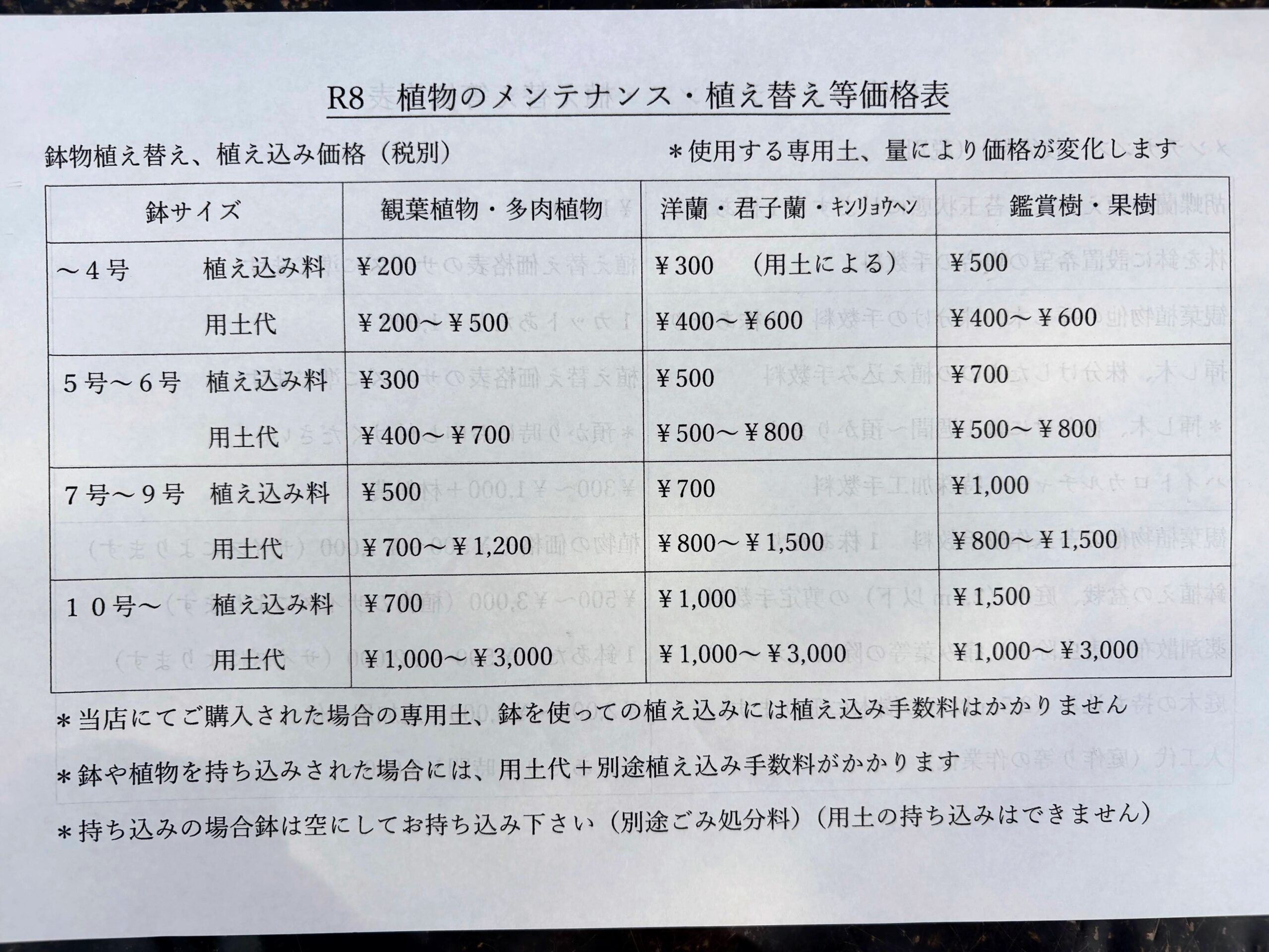 *処理に時間のかかる植え替えは持ち帰り処理しますので別途配達料がかかります