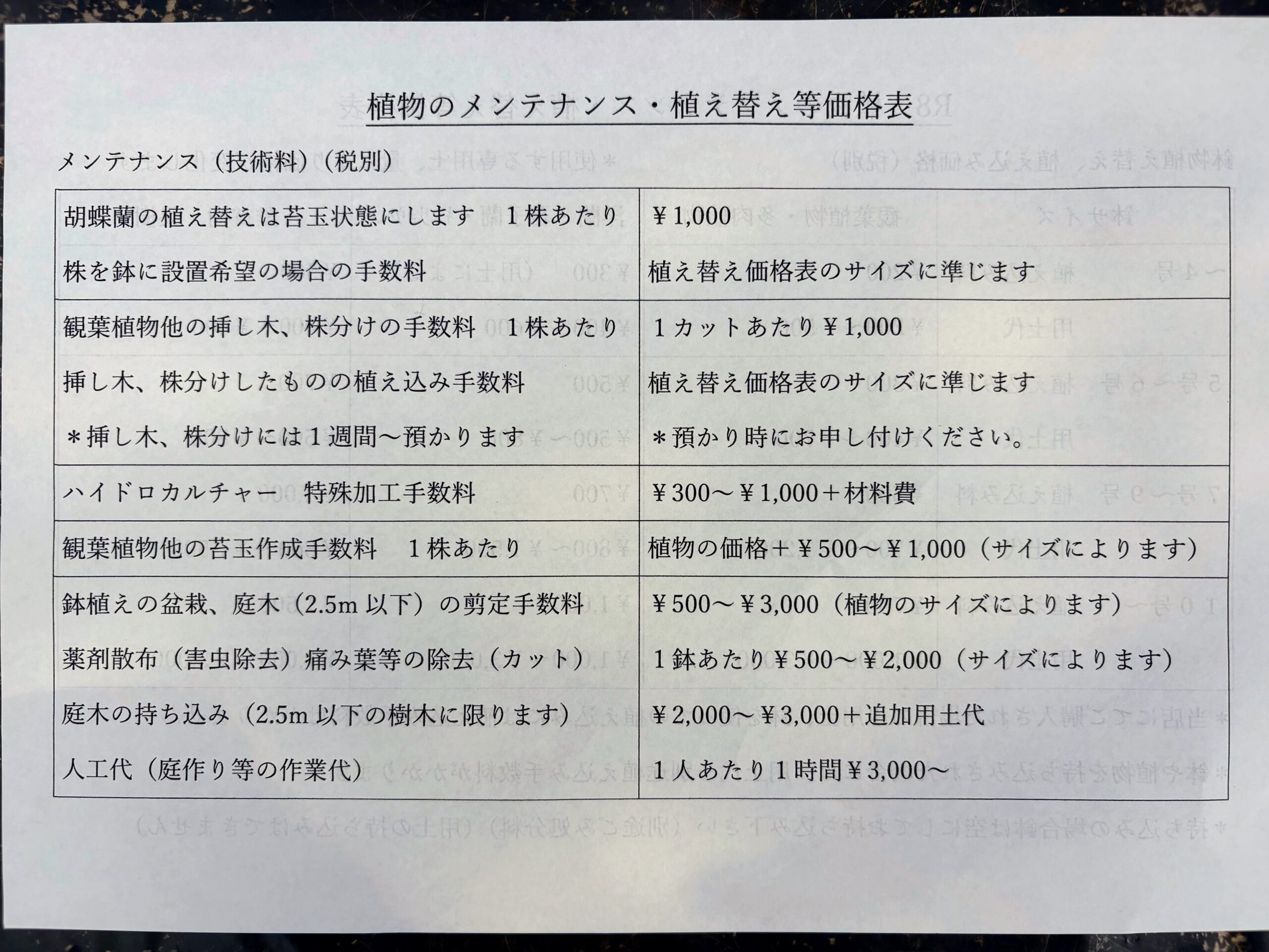 植え替え等料金表