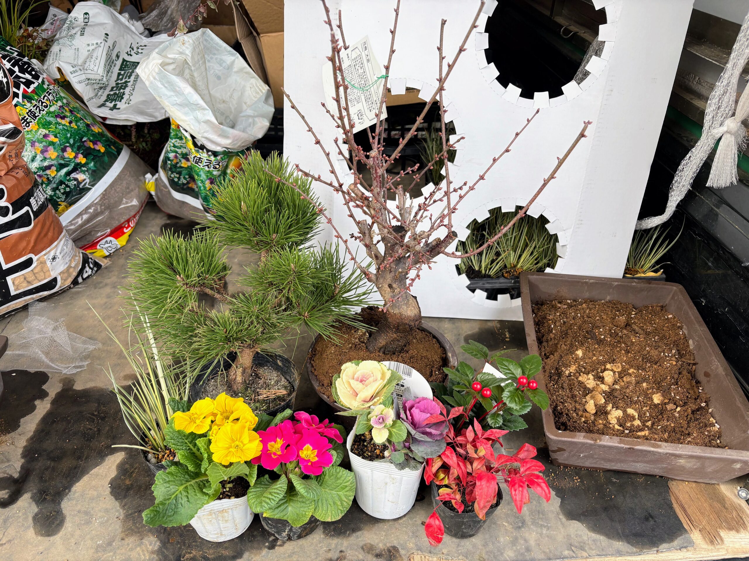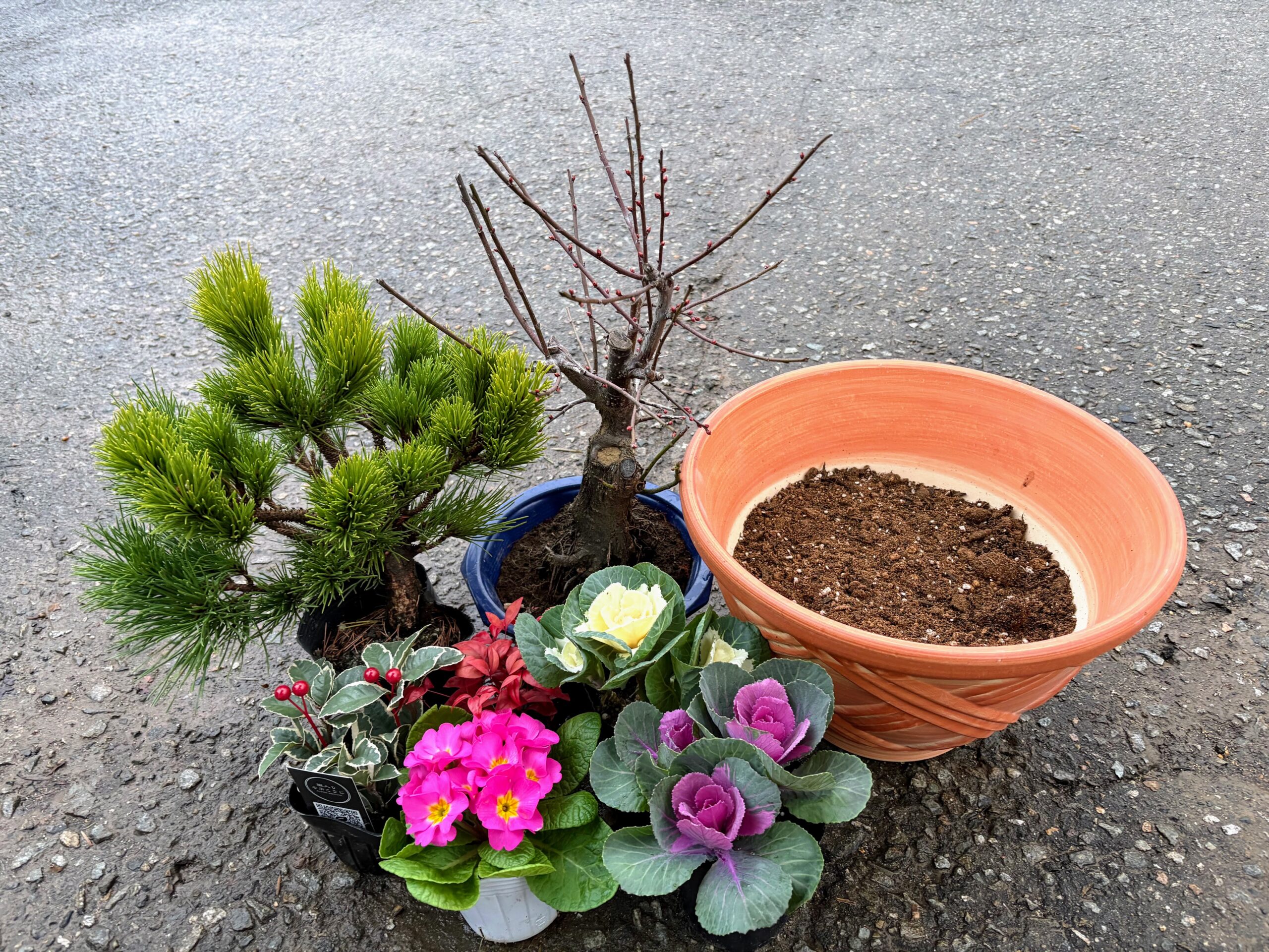 ではお正月風松梅の寄せ植え作りやってみましょう