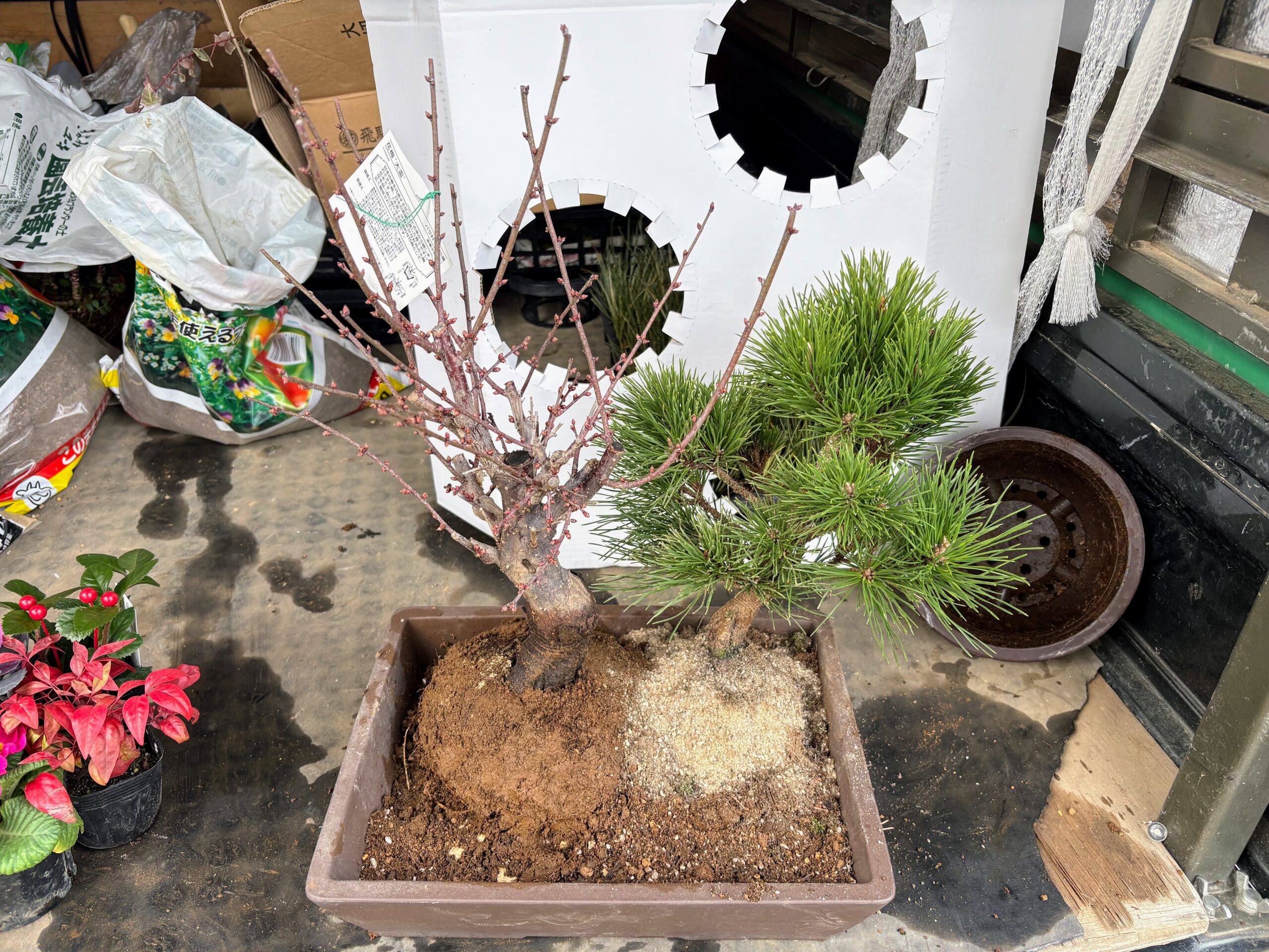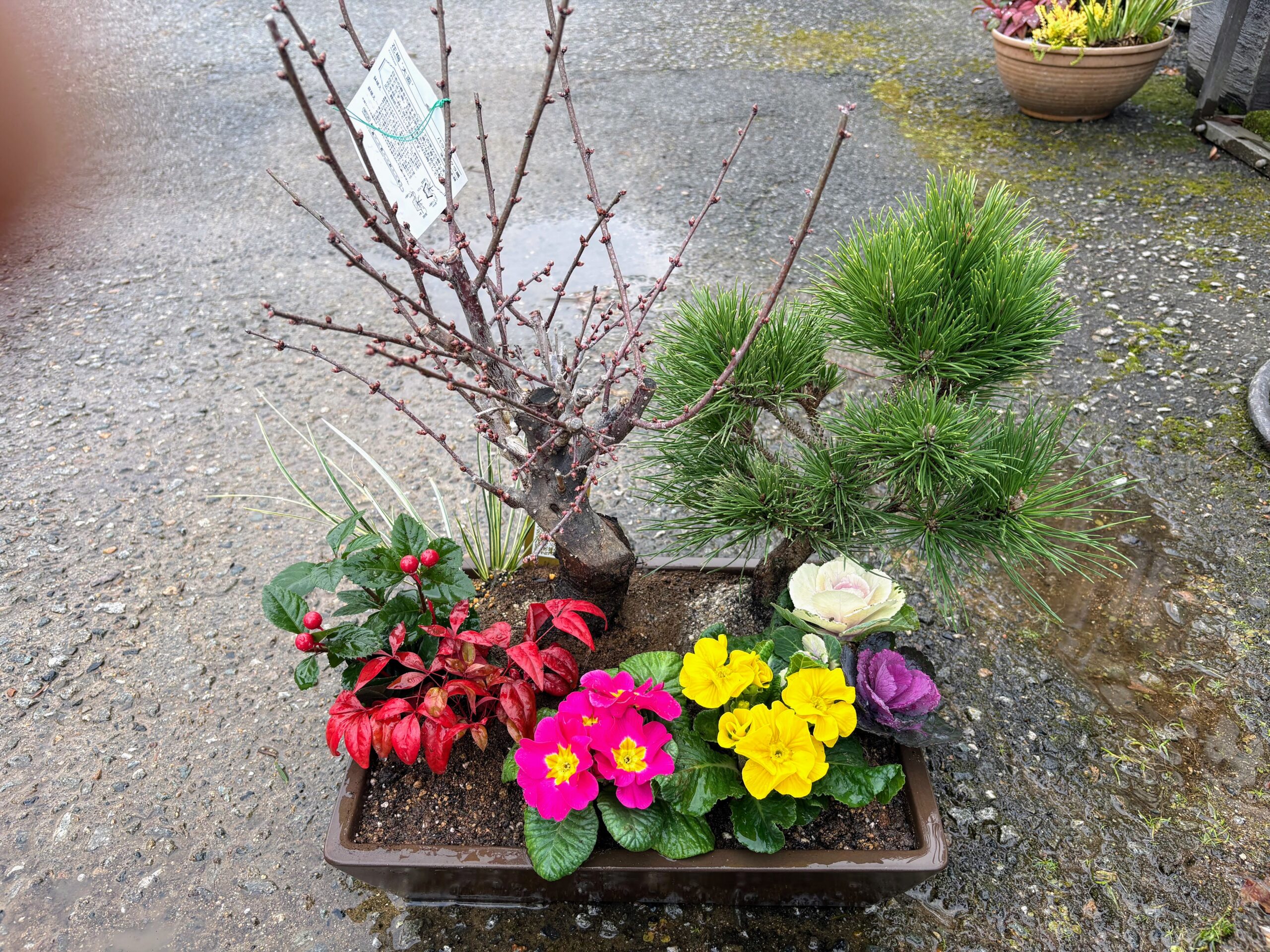 どちらかだけを使う盆栽もありますが、お正月風の寄せ植えとなると梅と松が並ぶ形となりますね
