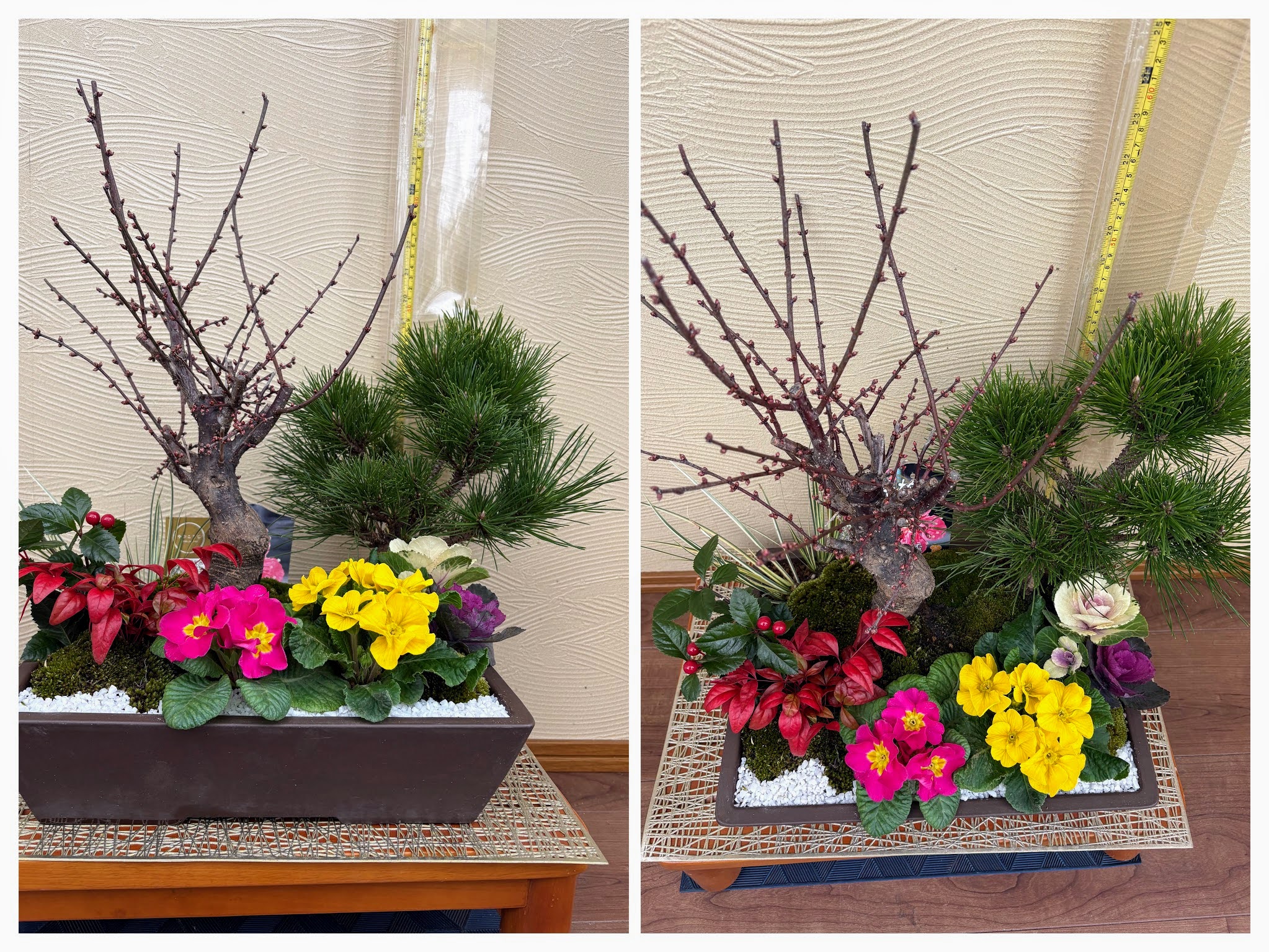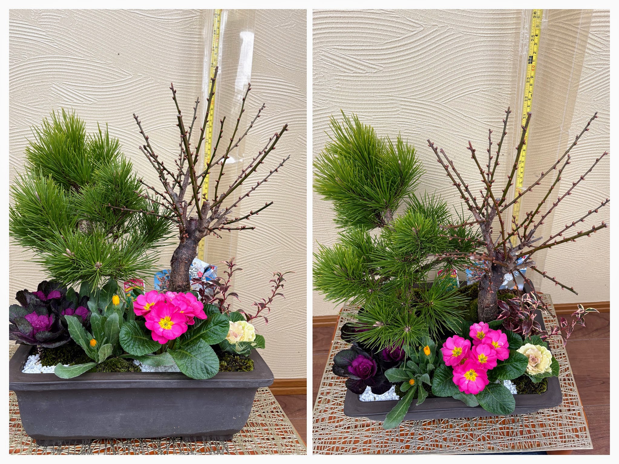 どちらかだけを使う盆栽もありますが、お正月風の寄せ植えとなると梅と松が並ぶ形となりますね