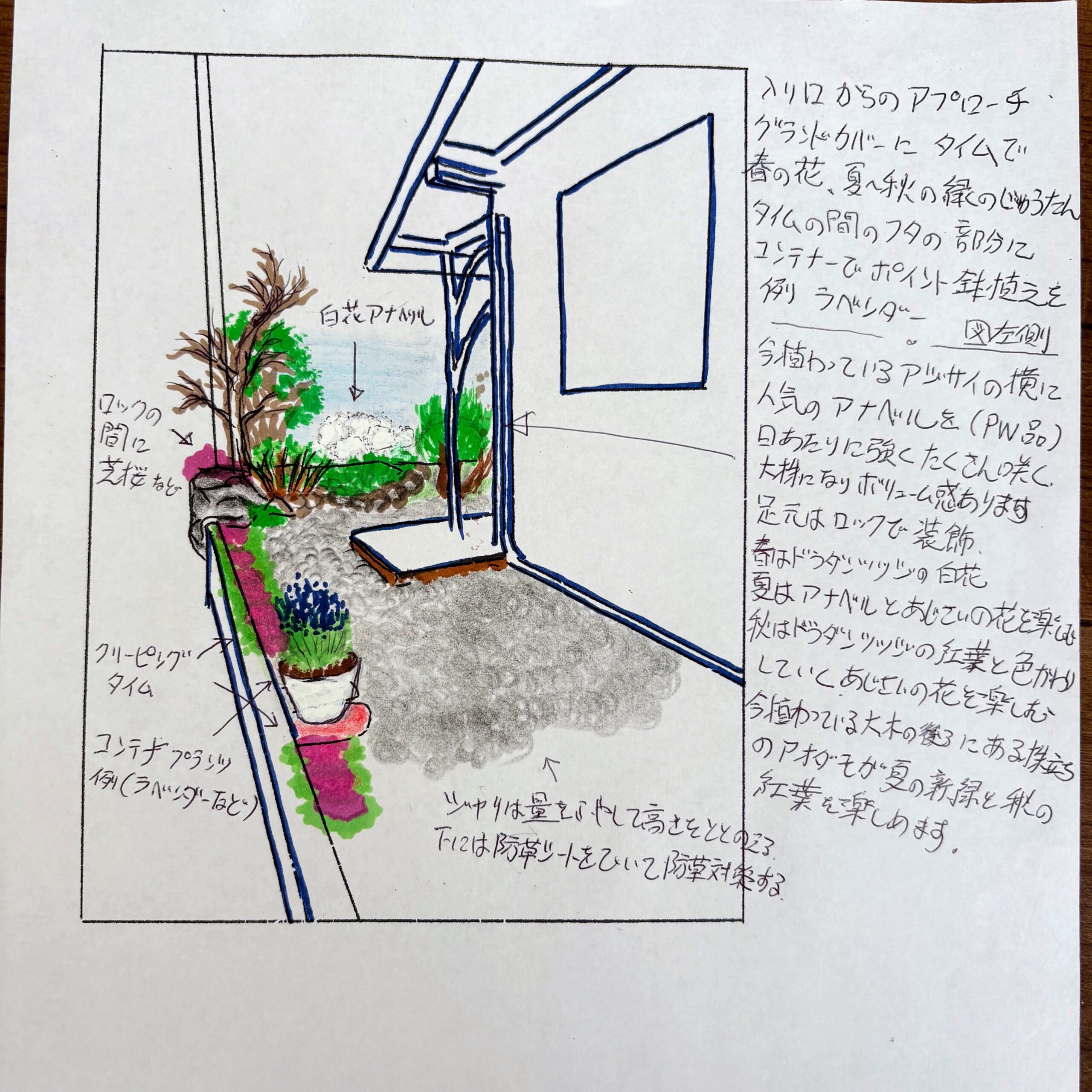 中央に植わってるドウダンツツジは春の花と秋の紅葉を楽しめますね